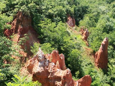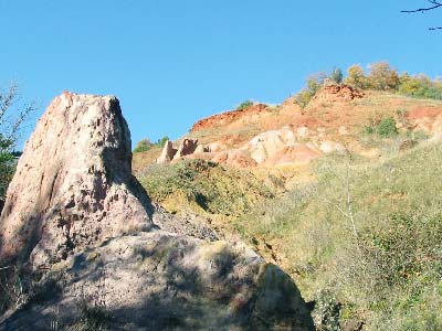 Curieux paysage que celui offert par la Vallée des Saints, située à Boudes, dans le Puy-de-Dôme. L'endroit est hérissé d'étranges pics de teinte ocre et rouge, sculptés par l'érosion, dont les silhouettes évoquent de gigantesques statues...