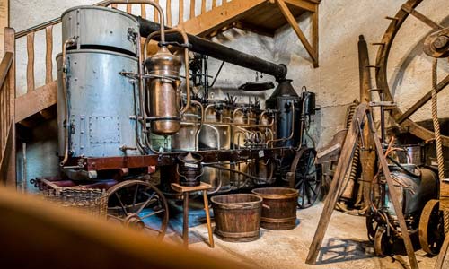 alambic de 1904 à 4 roues et 4 vases, pressoir à vis monumental du XVIIème siècle, salle consacrée à l’étude des instruments et techniques de labour dans le vignoble et dans le Bourbonnais (cartes de répartition, frontières linguistiques et ethniques)...