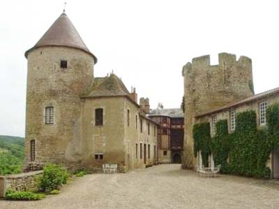 A l'ouest la cour s'étrangle pour former la cour d'honneur du château, limitée à l'ouest et au sud, par des bâtiments formant l'ensemble des pièces dites de réception (le salon, la salle à manger, la galerie et le grand salon). Ces pièces sont décorées d'une cheminée Louis XIII, de tapisseries d'Aubusson et de peintures du XVIIème siècle. L'ensemble des murs et des bâtiments est flanqué de quatre tours. Au sud, sur les fondations du XIIème siècle, une terrasse domine les rives de la Sioule. Les seigneurs de Bourbon, poussant leurs possessions face à l'Auvergne, avaient mesuré l'importance du passage obligé de la Sioule, et au milieu du XIIème siècle, Archambaud VI implanta une première fortification pour contrôler la vallée. De 1213 à 1273, la seigneurie de Rochefort fut confiée à Gui de Dampierre, il épousa Mathilde de Bourbon et fortifia le premier édifice.