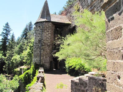 Le château de la Rochelambert, est accroché sur une falaise de basalte, reste d'un ancien volcan. C'est à cet endroit chargé d'histoire que s'installa la famille de La Rochelambert dès le XIIème siècle. La légende veut que George Sand y séjourna en 1859 lors de son second voyage en Auvergne et en Velay. Certains avancent qu’elle vint même accompagnée de son amant Frédéric Chopin. En fait, l’auteur de "La Mare au diable" vint bien à La Rochelambert le 14 juin 1859, mais n’y resta que l’après-midi. La visite furtive de la célèbre romancière se rajoute au riche passé historique du château. Une chambre lui est d’ailleurs dédiée, meublée d’un lit à baldaquin ayant appartenu à la marquise de La Rochelambert, amie de George Sand. Sont également visibles des portraits et des lettres de l’écrivaine. Dans la vallée de la Borne, ce château, longtemps qualifié de gentilhommière, abrita depuis le XIème siècle l’illustre famille Vellave des "La Rochelambert". On dirait que cette bâtisse est découpée dans la roche, dont elle porte pour partie le nom, tel un bas relief, le coup de ciseau ferme, vigoureux mais précis. La main sûre et le coup d’œil étonnant, tout à la fois simple, délicat et élégant dans sa noblesse. Tel un bibelot posé dans un écrin de verdure aux pieds de la Borne, avec ses tours aux couleurs sombres de la pierre volcanique qui se perdent dans les grands arbres, tout participe au mystère.