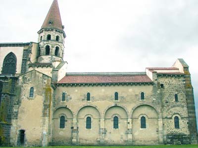 L'architecture de la nef et du transept de l'église romane est particulièrement remarquable : une des plus belles choses qu'on puisse voir en Auvergne, un des chefs-d'œuvre de l'art roman disent les archéologues qui ont le plus récemment étudié cette église. On constate que dès la fin du XIème siècle, l'art roman auvergnat avait mis au point les données sur lesquelles furent bâties les églises de type Notre-Dame du Port. Malgré ses petites dimensions (nef : longueur 18,17m, largeur 3,75m, hauteur sous voûte 13,30m, bas côtés largeur 2m, hauteur 6,20m), l'architecture est d'aspect tout à fait monumental. L'église a un axe dévié légèrement vers le sud-est d'où son inégal raccordement avec la partie occidentale. La collégiale est une des plus anciennes églises majeures d'Auvergne. Le nef date des années 1070. Malheureusement elle a été mutilée (en particulier, le chœur), ce qui en reste est néanmoins remarquable. Seuls le transept saillant et les 3 nefs subsistent de la construction romane, l’une des plus anciennes de la région : 3 nefs étroites mais bien proportionnées.